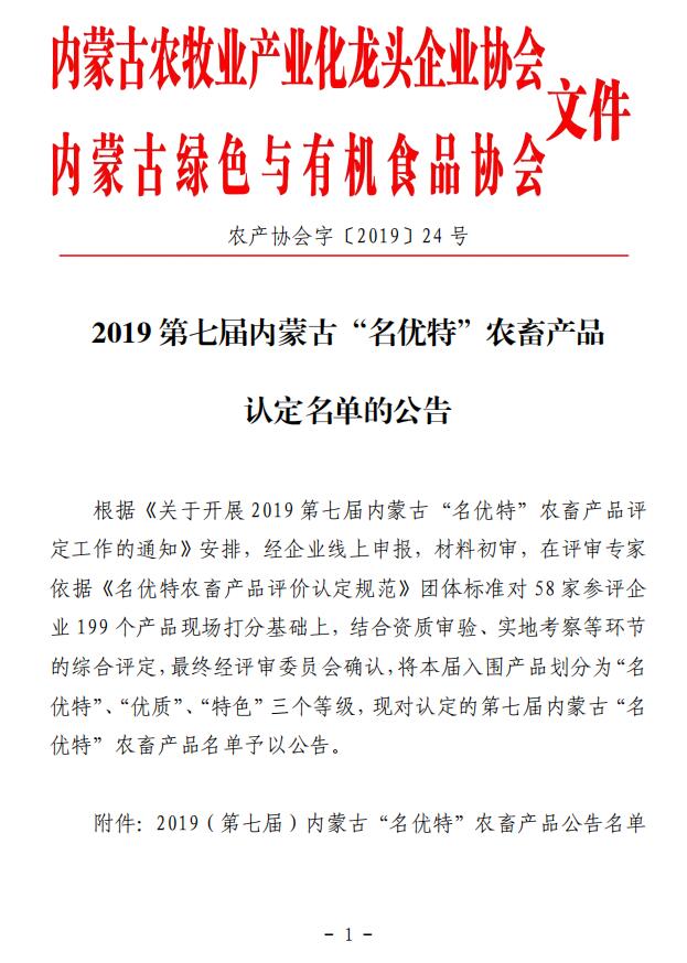 2019年(第七屆)內蒙古“名優(yōu)特”農畜產(chǎn)品認定公告名單