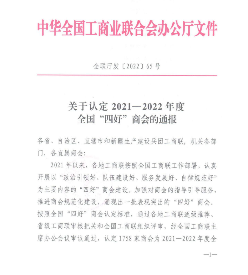 近日,中華全國工商業(yè)聯(lián)合會辦公廳發(fā)布《關(guān)于認定20212022年度全國“四好”商會的通報》,通報指出,按照全國“四好”商會認定標準,在各地工商聯(lián)逐級推薦、省級工商聯(lián)審核把關(guān)、全國工商聯(lián)組織評審的基礎(chǔ)上,經(jīng)全國工商聯(lián)主席辦公會議審議通過,評選出2021-2022年度全國“四好”商會。內(nèi)蒙古農(nóng)牧業(yè)產(chǎn)業(yè)化龍頭企業(yè)協(xié)會等42家商(協(xié))會榮獲2021-2022年度全國“四好”商會榮譽稱號!