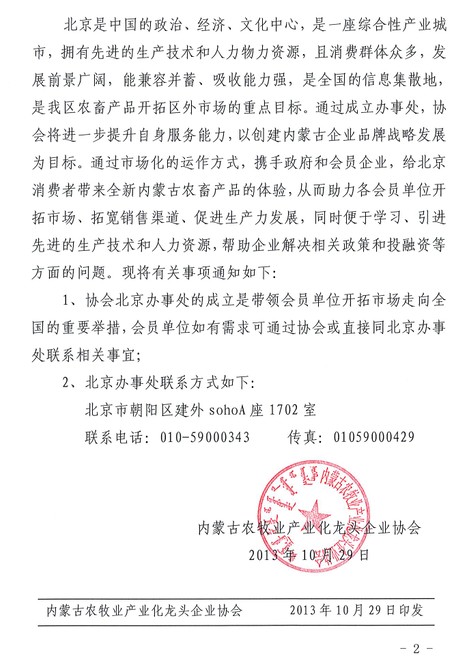 關(guān)于內蒙古農牧業(yè)產(chǎn)業(yè)化龍頭企業(yè)協(xié)會(huì )成立北京辦事處的通知