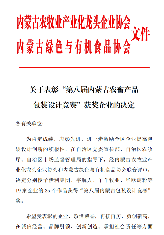關于表彰“第八屆內(nèi)蒙古農(nóng)畜產(chǎn)品包裝設計競賽”獲獎企業(yè)的決定