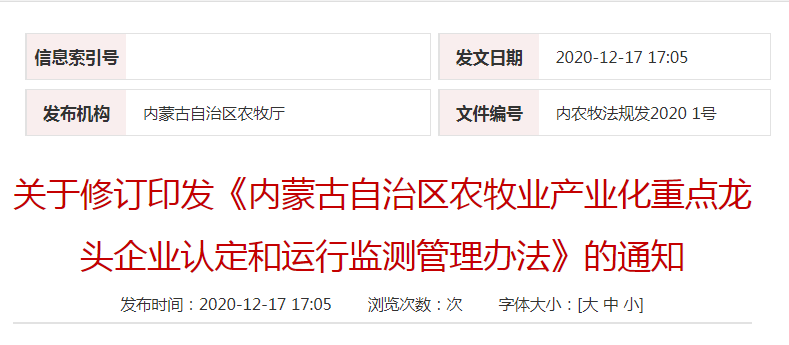 標(biāo)題:關(guān)于修訂印發(fā)《內(nèi)蒙古自治區(qū)農(nóng)牧業(yè)產(chǎn)業(yè)化重點(diǎn)龍頭企業(yè)認(rèn)定和運(yùn)行監(jiān)測(cè)管理辦法》的通知