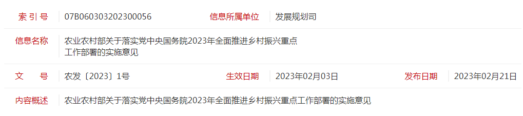 標題:農發(fā)〔2023〕1號農業(yè)農村部關(guān)于落實(shí)黨中央國務(wù)院2023年全面推進(jìn)鄉村振興重點(diǎn)工作部署的實(shí)施意見(jiàn)