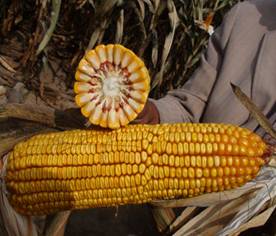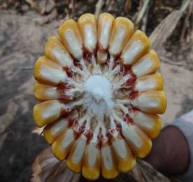 春播區(qū)從出苗至成熟126天左右。株型緊湊,株高271-286cm,穗位96cm。穗行數(shù)16-18 行,紅軸,果穗整齊、均勻;出籽率高達90%,軸細、粒深;長勢整齊一致,不空桿,產(chǎn) 量年度間差異小,穩(wěn)產(chǎn)性好。
