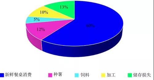 中國馬鈴薯總消費量基本穩定,但預計未來(lái)十年將略有增長(cháng)。業(yè)內人士估計,中國60%的馬鈴薯是在家里或餐館用于鮮食消費。這與幾年前相比并沒(méi)有變化,因為馬鈴薯仍然是中國消費者的主食。中國馬鈴薯總量的約10%用于加工業(yè)消費,12%用于種薯消費,5%作為飼料消費,儲藏造成的損失約為13%。根據《中國農業(yè)展望報告》預測,鮮食消費的馬鈴薯將年增長(cháng)0.3%,加工消費的馬鈴薯將年增長(cháng)1.3%,飼料消費將年增長(cháng)0.5%,種薯消費和儲藏損失每年將分別增加1.1%(圖3)。